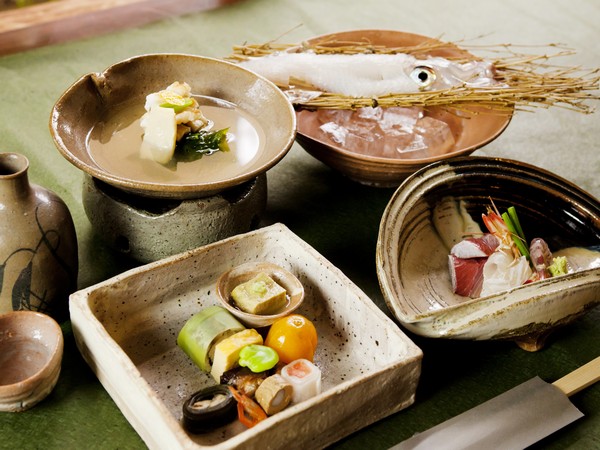 当宿では、玄界灘で獲れた新鮮な天然魚貝を柱に、山海の素材の余韻をお愉しみいただくべく、出汁はもとより、水・塩・醤油・味噌と全てにこだわってご提供しております。