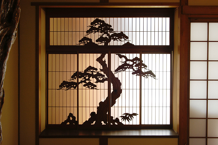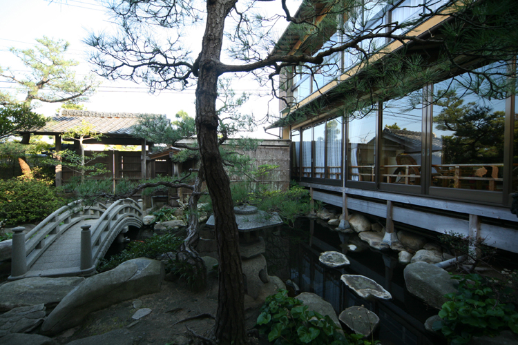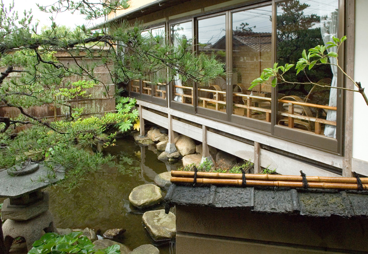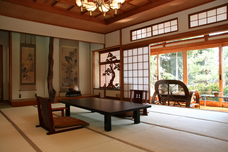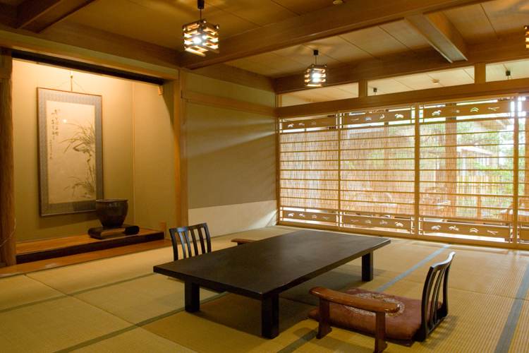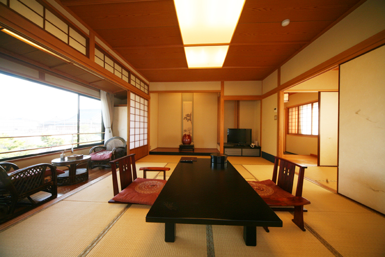 大きな窓のある、広々としたお部屋。風情あるお庭で、ごゆっくりと。